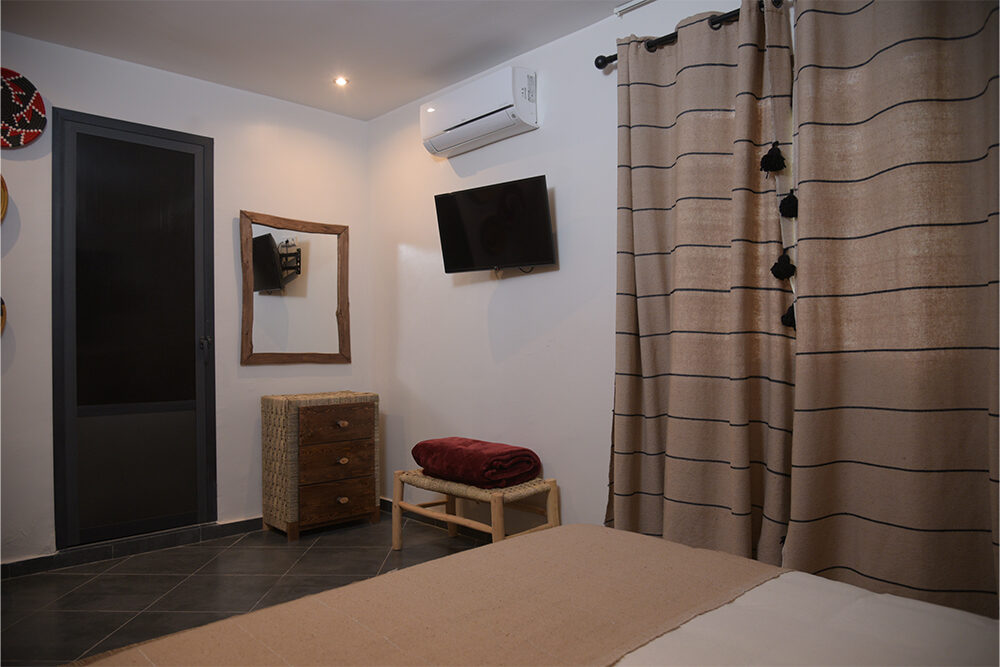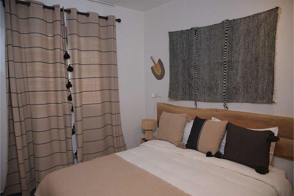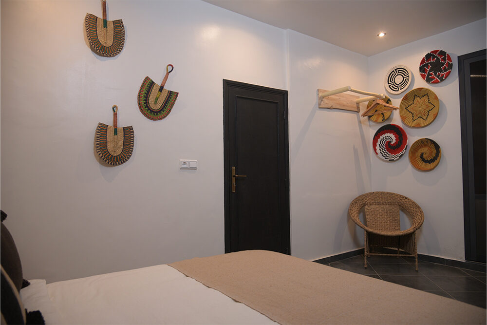 La chambre, nichée au cœur de Stifadma, est un véritable havre de paix. Les murs en tadelakt, d’un beige chaleureux, reflètent la lumière douce qui pénètre par les moucharabiehs finement sculptés. Le sol en zelliges colorés crée un tapis de mosaïque éclatant. Un lit à baldaquin drapé de voiles légers trône au centre, entouré de meubles en bois sombre finement travaillés. Les coussins aux motifs berbères ajoutent une touche de couleur vive. Le parfum délicat du jasmin flotte dans l’air, complétant cette atmosphère sereine et raffinée.